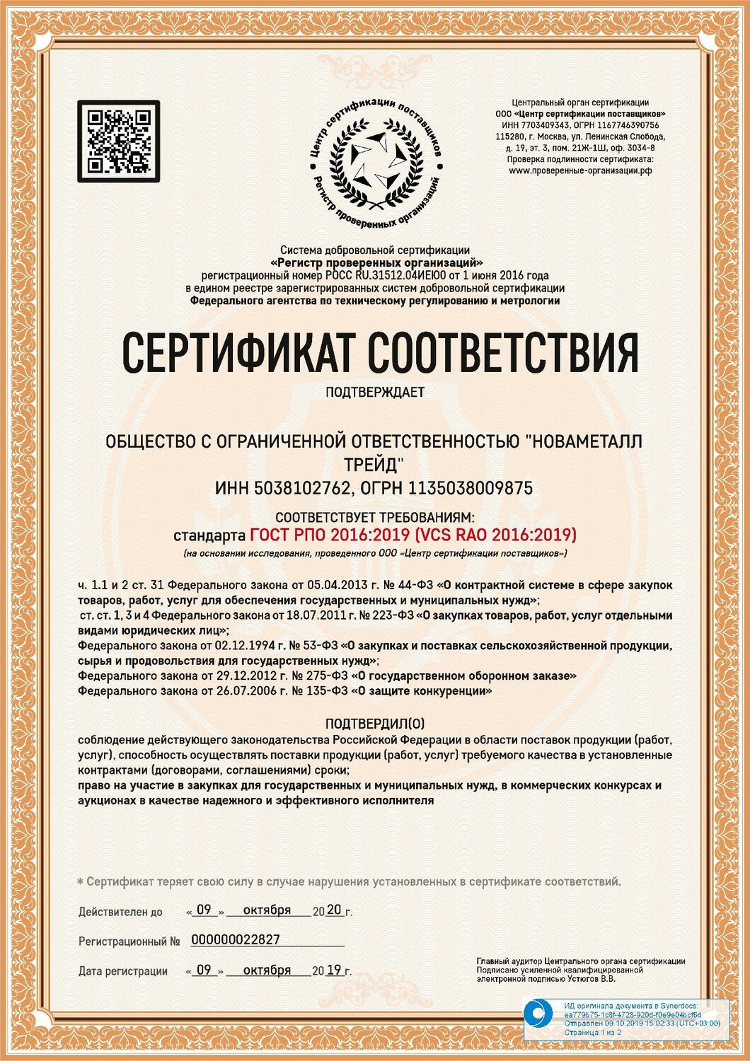 Сертификат соответствия: